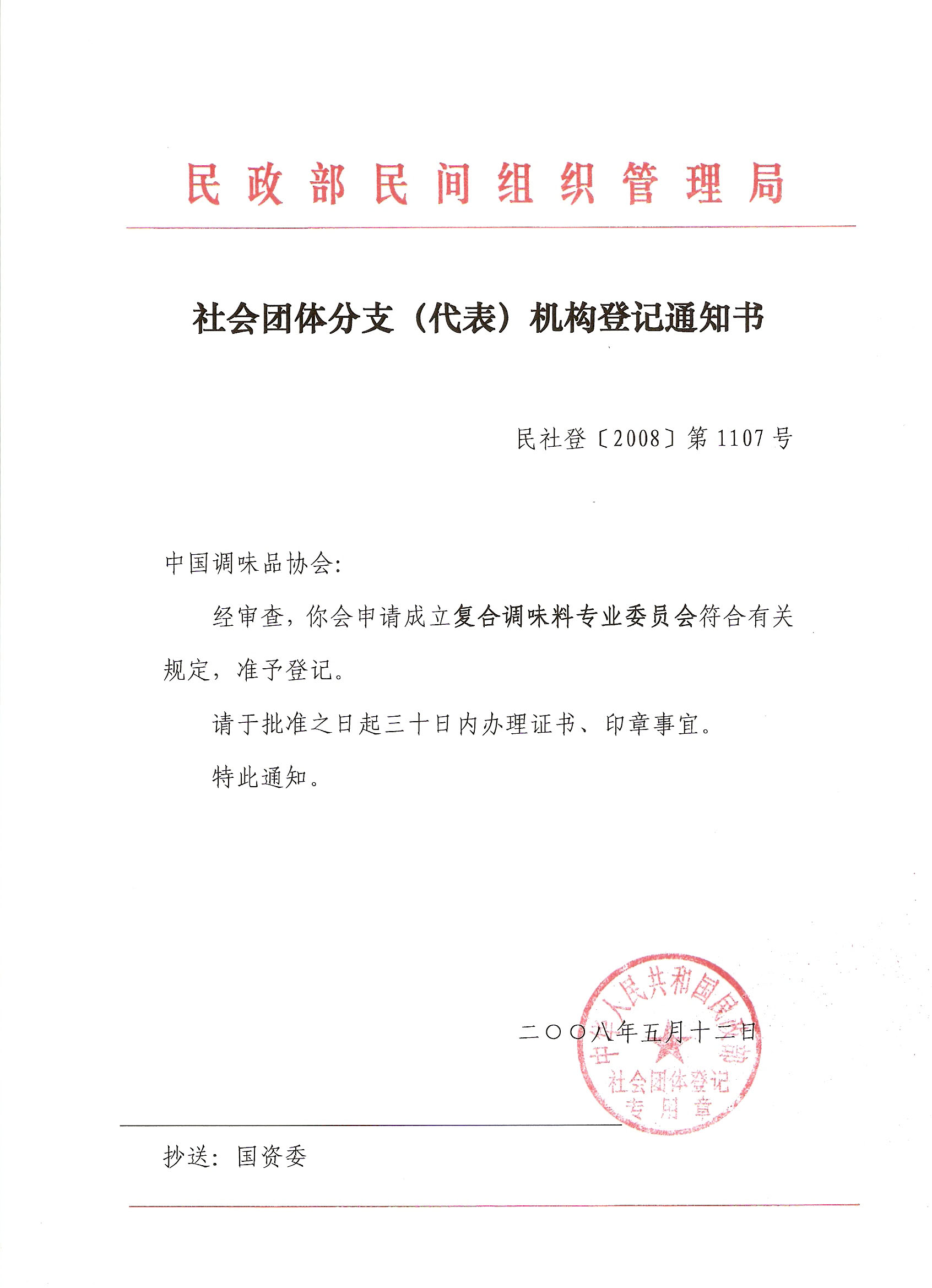 经中华人民共和国民政部(民社登[2008]第1107号文件)(见附件一)批准,羞羞在线视频(以下简称协会)复合调味料专业委员会正式成立。